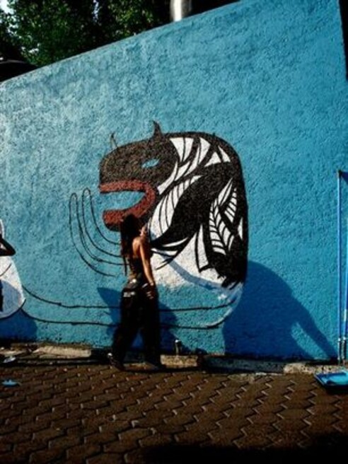 It´s easy to realize in her works the closeness with letters, books, prints, and photos.. Part of a artistic and cultured family, she lived between Brazil and Mexico and has all this different cultures influencing her art .. Fefê Talavera had her art¹s Bachelor from FAAP at São Paulo, however, she searches primordial energy at the streets what she could not find at any schools. environment, more emotional than theoretician energy, much more visceral energy. The type animals are as a subconscious mind revolt to demonstrate that all letters, all the graphical signals had been invented to be able to describe human emotions and not to command them, because our emotions are dirty and not civilized. She does not do cute and female paintings. She creates strong and disturbing animals, that lives at the shady part of our soul. Fefe is only 27 years old and has been treading a good delineated way of the artists who has something to say and knows how to make it.