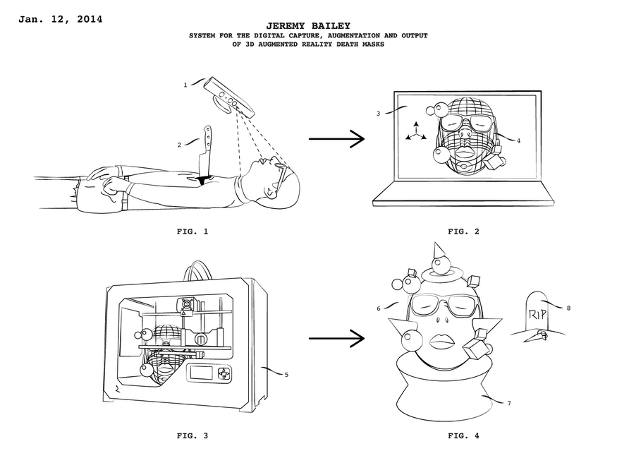 My time at quartier21 was wonderful. The history and significance of the venue was inspiring and the staff was supportive. I continue to draw inspiration from my time there, and have begun a second project inspired by Sisi's death mask (on display at the nearby Sisi museum) and the recent death of my grandparents. It will consist of a series of death masks for modern times, scanned from the faces of ordinary people and printed in bright 3d printed plastic. I've attached a patent drawing that describes the process I hope to undertake.
