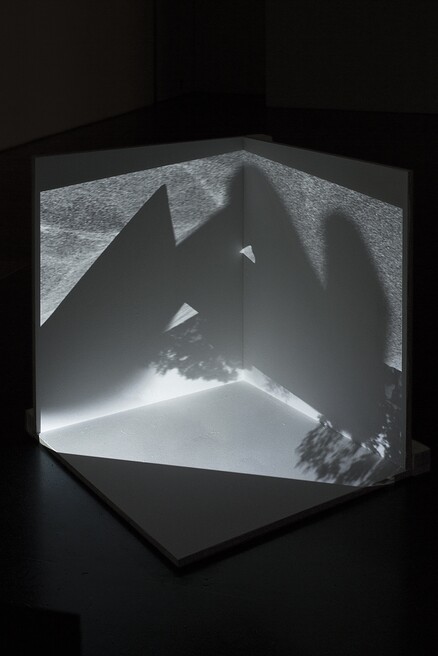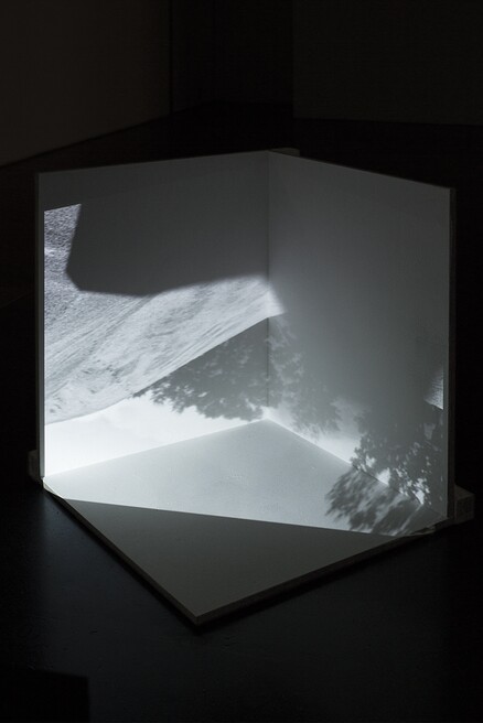 The slowly waving shadow of a flag on pavement and wall was filmed, and is projected on a wooden, L-shaped stage, resulting in a double break of the image. This double projection extends on the surrounding architecture of the exhibitions space.