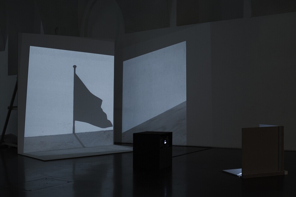 The installation is built around a video projection showing the shadow on a pavement and wall of a flag slowly waving in the wind.