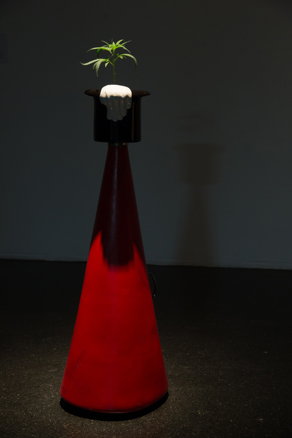 Karthik Pandian’s (USA) “Abracadabra,” 2013, is a sculpture consisting of readymade elements: a megaphone typical from use at demonstrations, topped with a magician's top hat and gloves. This awkward composition engages with protest and the many aspirations related to it. The aesthetics of the sculpture echo the button used for the 1967 action "Levitate the Pentagon." Nothing touches the ground; the sculpture is an ironic reminder of the "miraculous" power that underlies social uprising.