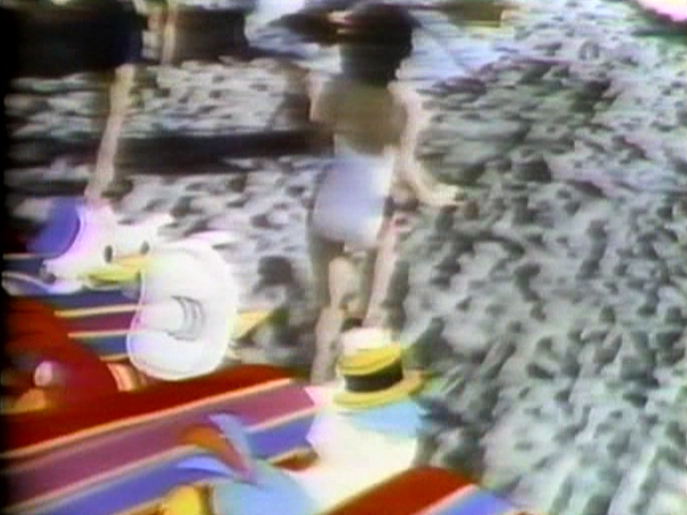 The video Beach, Umbrella is based on a sequence from the 1944 full-length Disney film “Three Caballeros,” where animated characters interact with live actors: Donald Duck and two other male characters swoop down on a flying carpet over Acapulco, spying on (real) women on a beach below through a telescope. Donald Duck subsequently dives off the carpet and ends up chasing the women. The original poster calls on viewers to “gasp with amazement as three feathered Don Juans get gay with REAL-LIFE lovelies.”