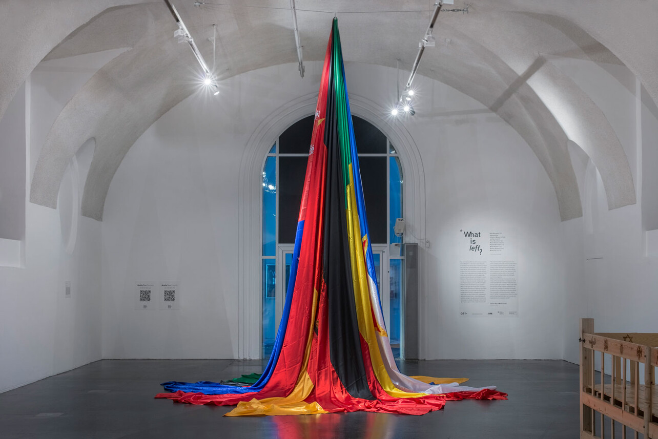 Nasan Tur explores political ideologies, subliminal messages, and symbols of power and dissent, all of which are present throughout his six-meter-high installation “Once upon a time”, which shows eight different national flags of countries that no longer exist – hence questioning what is left thereafter.