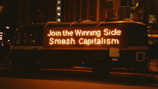 Petra Gerschner* stages a 12-meter-long “red carpet” with the glowing slogan “join the winning side – smash capitalism” to hint at the necessity and potentiality of a different society, thereby standing in opposition to dominant power systems and phenomena of exclusion. Appropriating and collectivizing the “red carpet” breaks the dichotomy between actor and viewer, while the celebrity wall next to the carpet displays not logos but rather a video loop showing policemen in a spacey search for the remains of a past rebellion.
