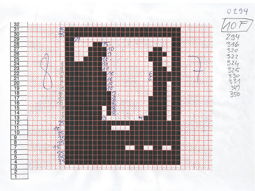 My diploma film project, ‘Tele-Dialog‘, is about afternoon and early evening entertainment television, which is rather simple in terms of themes and style. The animated film consists of 800 individually knitted pictures, produced by myself. I created a video template and turned it into pixel images, which I then printed out and used for knitting instructions: one stitch per pixel. This technique turned out to be very ambitious. The result was ’wool sausages’, which I had to iron, starch and put on a nail board in order to take pictures.