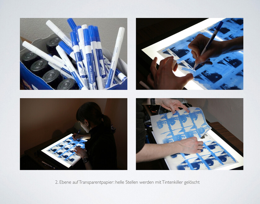 MW: You invent elaborate techniques for the production of your animated films, requiring time-consuming manual work. Can you tell us a bit more about your works ‘Tele-Dialog‘, ‘In erster Linie‘ and ‘Tintenkiller‘?