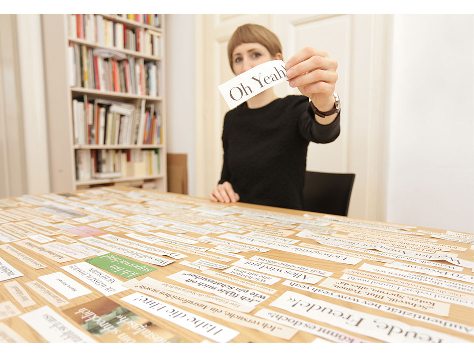Veronika Schubert: I love to draw on the abundance of material. From thousands of sentences in my archives, I have selected specific newspaper headlines which relate to themes of art, have similar structures and allow a kind of humorous approach through condensation.