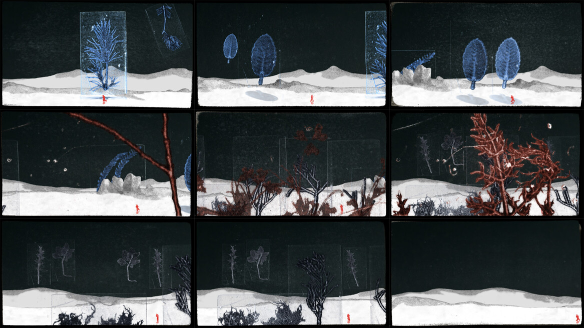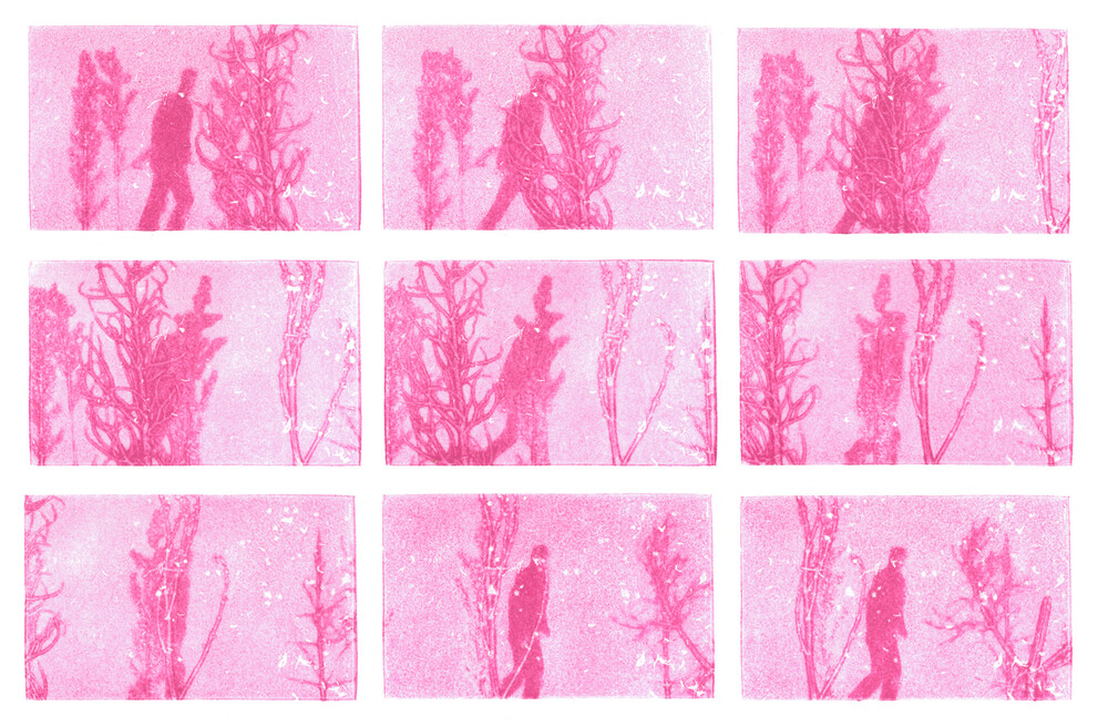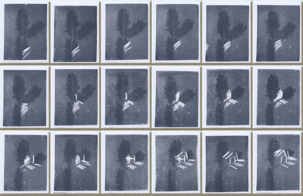 The images were made using a printing process I discovered by accident using felt, rubber, and ink. I found a roll of rubber in a box someone had left on the street with a note stuck to it containing one word, FREE. I took it to my studio and found that I could place a plant fragment on a clean piece of paper, then press the inked rubber onto the plant and paper. The plant fragment acting like a stencil, blocked the ink—producing a reverse silhouette. But, the ink is still within the rubber pad where it was blocked by the plant fragment, and the pressure displaces the trapped ink—in measure to the thickness, surface variation, and texture of the fragment. Setting the plant fragment and first impression aside, and pressing the same pad onto a clean piece of paper produces a second image resembling a microphotograph or rubbing taken from a low relief. Manipulating the plant fragments incrementally and repeating the pressings produces a sequence of frames for animation or mutoscope cards. In this project I also used hand cut stencils.