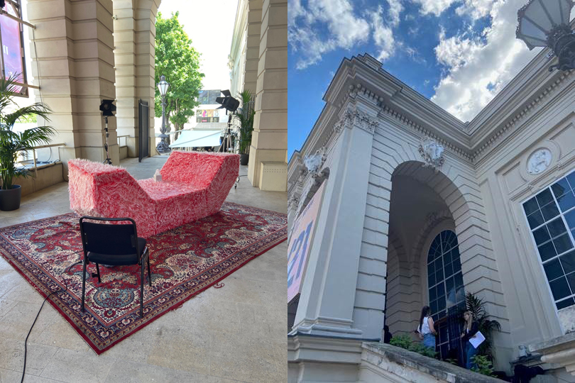 The portico at MQ Haupthof (main courtyard) is the chosen place for these dialogues: a half visible, half hidden space which offers the interviewees protection while, at the same time, creates a mostly acoustic connection to the visitors and the things going on in the main courtyard. Surrounded by the background noise of the courtyard, the interviewees sit down on a piece of ‘MQ monster furniture’, which is a bit reminiscent of a therapy couch. This shaggy, cheerful piece of furniture allows them to abandon rational thought for a while. Their own needs and emotions take centre stage. This environment facilitates personal conversations and intimate insights while also allowing for shared silence.