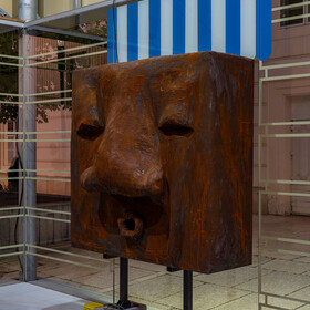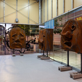 Five huge, bulky, top-heavy rust-coloured figures have come together in the MQ Art Box. Turned towards each other, but nevertheless introverted, they seem grim, brooding, and sorrowful, their foreheads and mouths puckered. They stand dauntlessly on their disproportionally small steel legs stuck in heavy concrete-block shoes. Something seems to be giving them a headache.