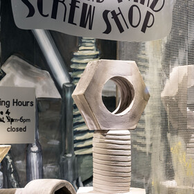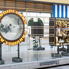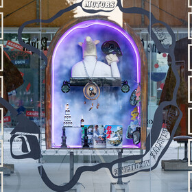 The open backs of their heads are pressed up against the glass façade, making it possible to look deep into their skulls. Bizarre arrangements can be discovered inside them: through the pane of glass, show window decorations are visible, revealing the product worlds of very different shops.