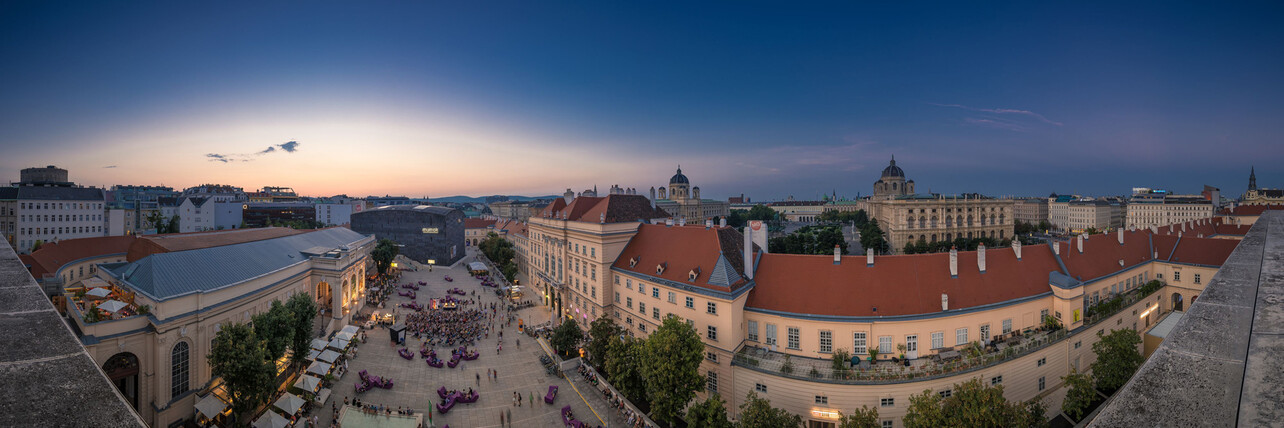 Zum Höhepunkt und Abschluss geht es noch einmal hoch hinaus: Hebt ab in luftige Höhen auf die MQ Libelle am Dach des Leopold Museums. Lasst den Tag mit einem Sundowner in der Hand und grandiosem Blick über ganz Wien ausklingen.
