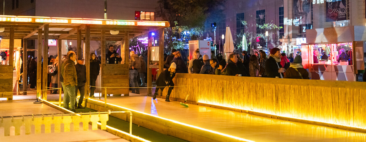 Bei der beliebten MQ Eisstockbahn kann auch heuer wieder auf zwei Bahnen gespielt werden! Die Gestaltung der Bahn und der Überdachung stammen von Künstler Martin Markeli. Spannende Wettkämpfe sowie jede Menge Fun und Action bietet die beleuchtete Eisstockbahn im größten Winterwohnzimmer der Stadt. Gespielt werden kann alleine oder im Team.