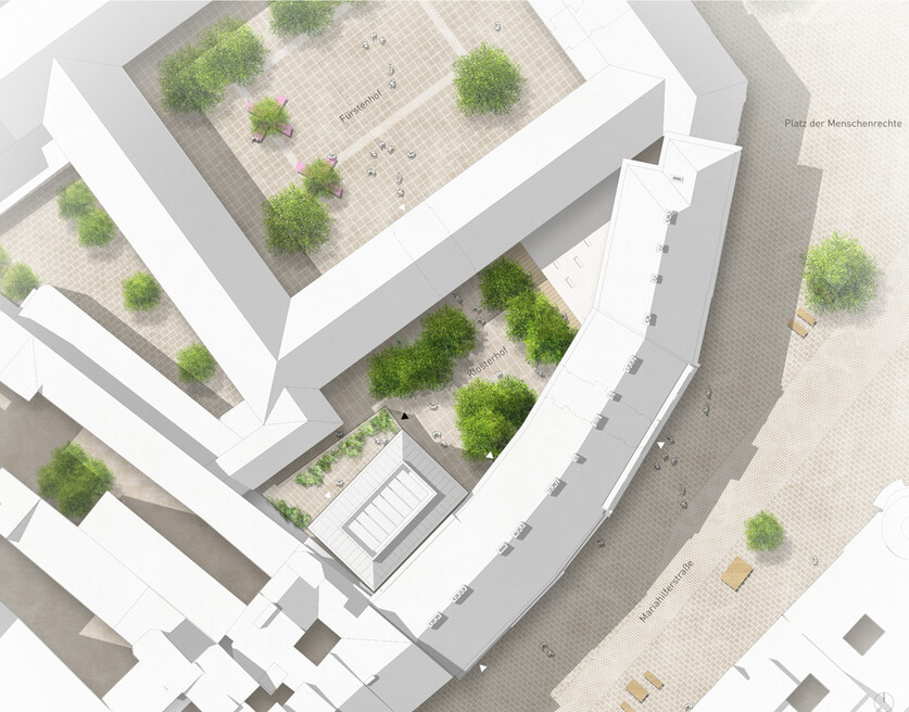 Für die Herstellung dieses Zugangs sowie die Adaptierung der erforderlichen Erdgeschoßfläche ist eine Absiedelung der derzeit dort beheimateten Büroräumlichkeiten sowie der Probebühne des Dschungel Wien erforderlich. Die im rechten Gebäudetrakt untergebrachte Bühne mit ihren Nebenräumen wird bestehen bleiben, für die neue Probebühne ist ein unterirdischer Neubau im Fürstenhof vorgesehen. Die Büroräumlichkeiten werden innerhalb des Areals in unmittelbarer Nähe und mit direkter Anbindung zum Theater angesiedelt.