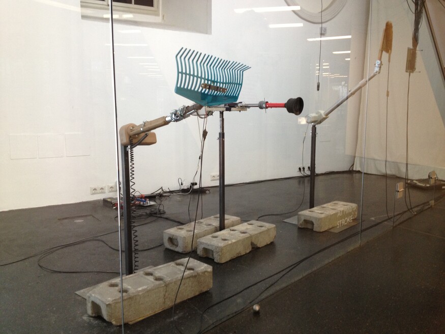 During my residency I created a new installation called "Stroke" specifically for the Schauraum, with the support of the Digital Arts Department at the University of Applied Arts Vienna and the Schauraum curators Wolfgang Fiel & Ruth Schnell. The piece consisted of large linear motors equipped with different objects such as a cleaning brush, a plunger, a window squeegee and a garden rake attached to their tips, leaning against the glass window, towards to viewer outside and performing a back-and-forth movement on the glass surface. The sounds that resulted from the interaction of objects with glass were amplified and could be heard through the loudspeakers just outside the glass window. The exhibition was also within the framework of MQ Summer of Sounds 2014.