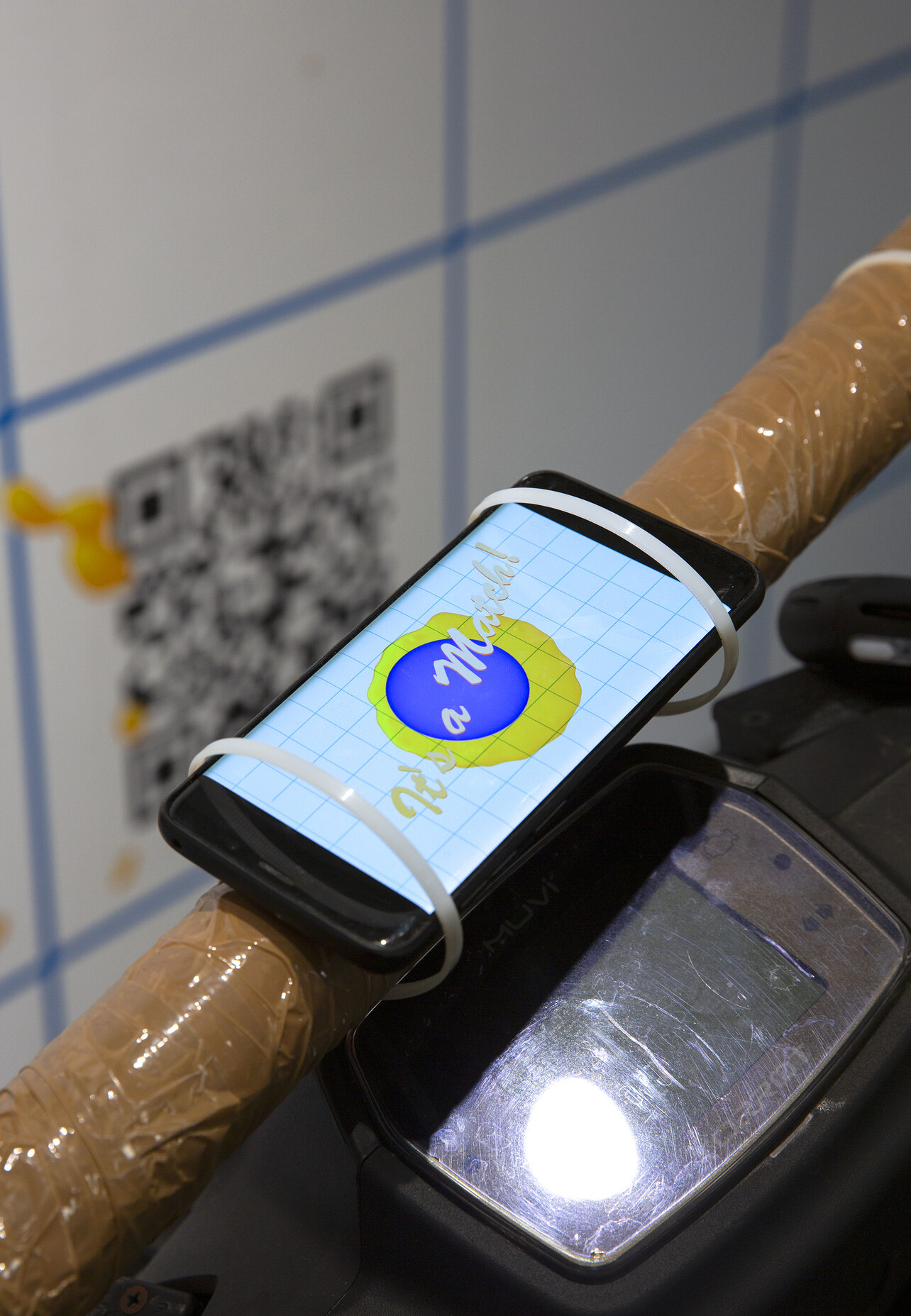 Diese verschleiernde Wohlfühlblase, die häufig um prekäre Arbeitsbedingungen herum gebildet wird, thematisierst du etwa auch in deiner Videoarbeit „From Me to We", die derzeit im EIKON Schauraum zu sehen ist – und die passenderweise auf Botendienst-üblichen E-Rollern abgespielt wird. Möchtest du uns kurz durch diese Videoarbeit führen?