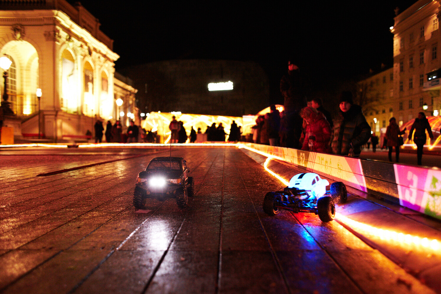 Auch dieses Jahr inszeniert der Licht- und Installationskünstler Martin Markeli das Wasserbecken zu einer Arena, die mit ferngesteuerten Modellautos von den Besucher:innen erkundet werden kann. Die temporäre Installation bietet Besucher:innen die Gelegenheit, über einen spielerischen Zugang das Gefühl des Wettbewerbs zu „er fahren“. Im Fokus der Installation steht das Zusammenspiel zwischen den „Spielobjekten“ und den Besucher:innen, die gemeinsam den öffentlichen Raum verändern.