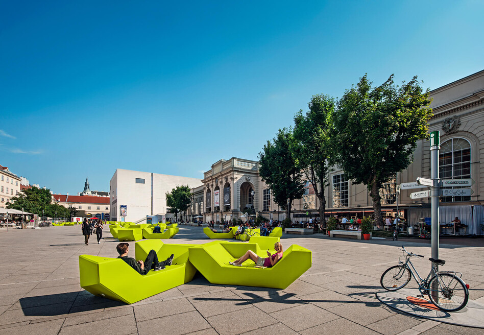 It all began with an art project in 2002. After the MuseumsQuartier opened in June 2001, there was hardly any seating in the MQ courtyards except for a few wooden benches and no artistic use of the space either. As a result, the MuseumsQuartier Errichtungs- und Betriebsgesellschaft (MQ E+B) commissioned Austrian artist Josef Trattner to create an art installation for the site in the form of giant foam objects. They were immediately seized on by visitors and enthusiastically put to use as seating. Based on the enormous success of this project, the MQ E+B invited several teams of architects to design versatile seating for the MQ courtyards. The idea put forward by the architects PPAG – Anna Popelka and Georg Poduschka – was chosen and the MQ courtyard furniture made its first appearance in the MuseumsQuartier in winter 2002, assembled as igloos as part of the “Winter im MQ” program series. In 2003 the seating was put out for the first time in summer and was an immediate hit with visitors, who used it for relaxing on and spending time with friends. Since then it has become impossible to imagine the MuseumsQuartier without it.