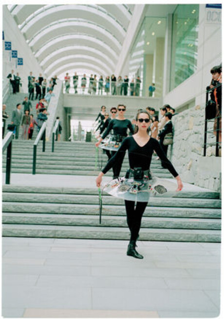 Via movement sensors they can also trigger electronic sounds that are subsequently choreographed -- or "orchestrated"-- into musical compositions as an "audio ballet" (YAMAHA choreography). A variety of other electronic instruments (mini-computers, samplers, contact microphones, cassette and MP3 players, and radio receivers) allow them to work with the sounds, surfaces, and topographies of the space around them in a variety of solo or group choreographies.