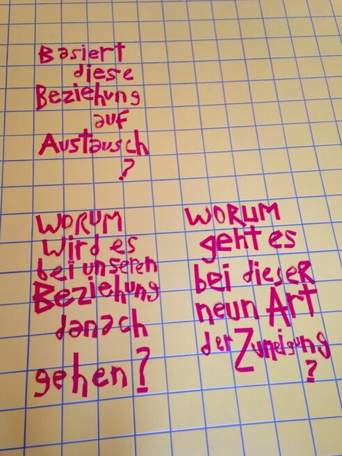 Day 1: arrived in Wien. I don´t speak German. I enter MQ for the first time in my life. Hot day. Mission: talk to strangers. That same night I met Moki and some valuable information popped out: Gruft Shelter near MQ. Day 2: Go to Gruft. Potentially find my performer. I found Steve. We talked. We shared some information. I told him I was coming back to see him again. I invited him to perform. Next days: Can´t find Steve. Communication was getting harder. Authorizations, Steve missing, still not speaking German. Day 5: I found Steve. We went to the Baroque Suite at MQ and shot our first and only video. His performance was all about talking. Speeches. I liked it a lot. Next days: just looking for him around the city, thinking of him. A random day in Wien: Visit Museums, exhibitions, and some walking around. I met Dalibor. Simultaneous Interpreter. I said I needed him. I needed help. Few days after: Dalibor came back to MQ to perform as an Interpreter, interpreting Steve´s low volume surreal German-English speech into clear German. That same day I invited Martina, whom I met at Autgarten Park, and saw for second time the night before the shooting in a party at Fluc. I decided I wanted to do a video with her doing some body poses I wanted Steve to do before his disappearance. Everything continued been only about Steve presence and absence. One day: Idecided to write some questions on a floor and took pictures of those German words I wrote without understanding them. After these photos I decided that my work was done. Lasts days: I continued looking for Steve but my hours where more about going to the lake to swim naked than staying inside a Museum or walking with clothes on.