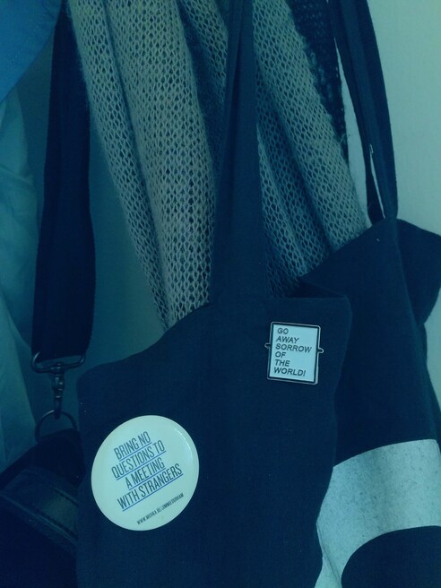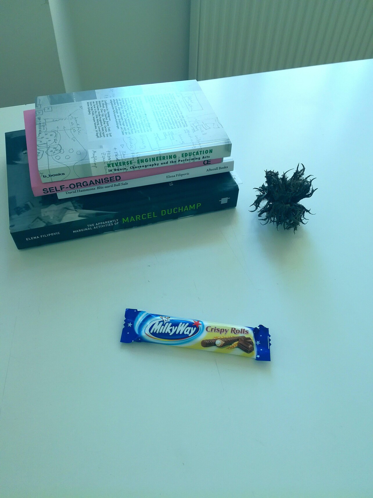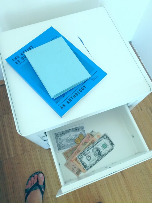 (some references and further reading in order of appearing: Mladen Stilinović’s sentence/work/statement, 1977; Milky Way chocolate from the work “One on One” by Hans Peter Feldmann, from the exhibition “Ways of Seeing,” Villa Empain, Brussels, 2017; a book “Self-Organised” Stine Hebert and Anne Szefer Karlsen (eds.), Open edition, 2013; a book “Reverse Engineering Education: In Dance, Choreography and Performing Arts” Ulrike Melzwig, Marten Spangberg, Nina Thielicke (eds.), 2005; two yellow bubble gums from the work “Measure of Happiness,” from the exhibition “How happy are you,” by Stefan Sagmeister, MAK Vienna, winter 2015; contact lenses “Evil Eye Hater Blocker,” by Yngve Holen, bought in the Berlin Biennale, 2016; a coin “One danae,” by Vadim Zakharov, picked up from the Russian Pavilion and a bill “Sorry” picked from the exhibition “Paradiso Lussemburgo” by Filip Markiewicz, in Venice Biennale, 2013; a book “The Artist as Curator: an Anthology,” edited by Elena Filipovic, Mousse publishing, 2017; entrance bracelet for “Rens Cool's Birthday Bash”; a can from “No bUll PRemiUm TAURiNe,” by Pieterjan Ginckels, from the exhibition “Eating Each Other” in ExtraCity, Antwerp – got it for my birthday, 2017; two badges, one from Jimmie Durham’s exhibition ““A Matter of Life and Death and Singing” in MHKA, Antwerp, 2012 and another “Go Away sorrow of the world,”by F&R R&F - Nel Verbeke’s donation for the Archive of Artistic Anxieties; …)