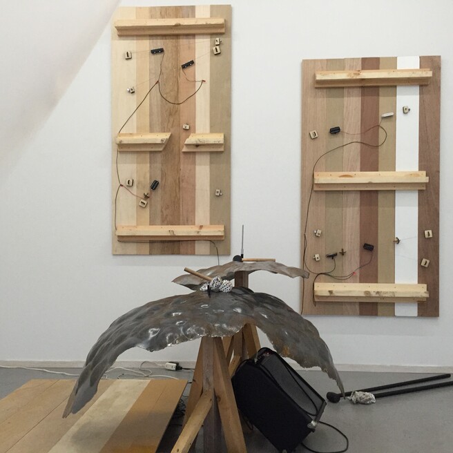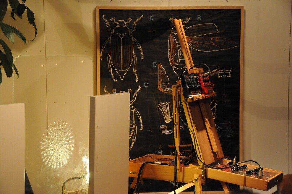 Linking the idea of prototypes to sketching, he thinks of both as thought that has solidified only slightly, enough to do things it cannot do inside the mind, but still malleable enough to exist as a frame for conversations that invite the unknown. In consequence, many of his works give voice to malfunctioning and unpredictable systems whose conversations he propitiates and moderates. Once materialized they can be encountered simultaneously as sound installations, stages, and musical instruments.