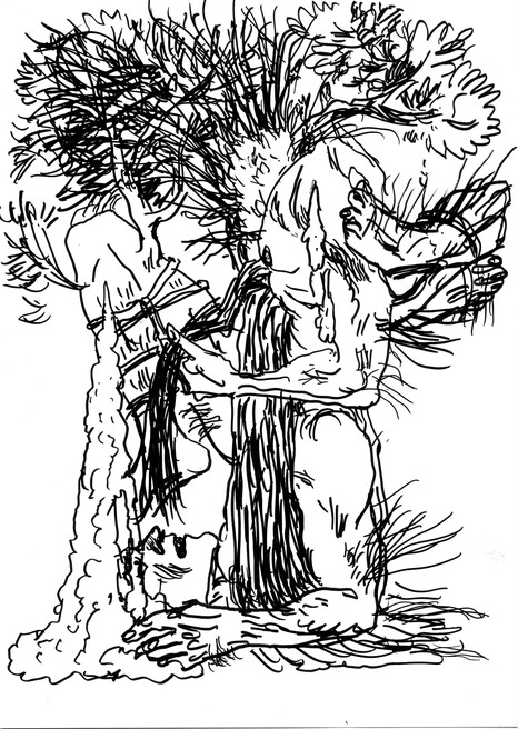 Graphic drawings from the series "Mystical Forest" in the project "What can be done? Praktiken der Solidarität". project of curator Michaela Geboltsberger. Traiskirchen, Austria