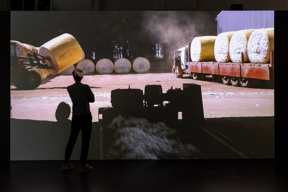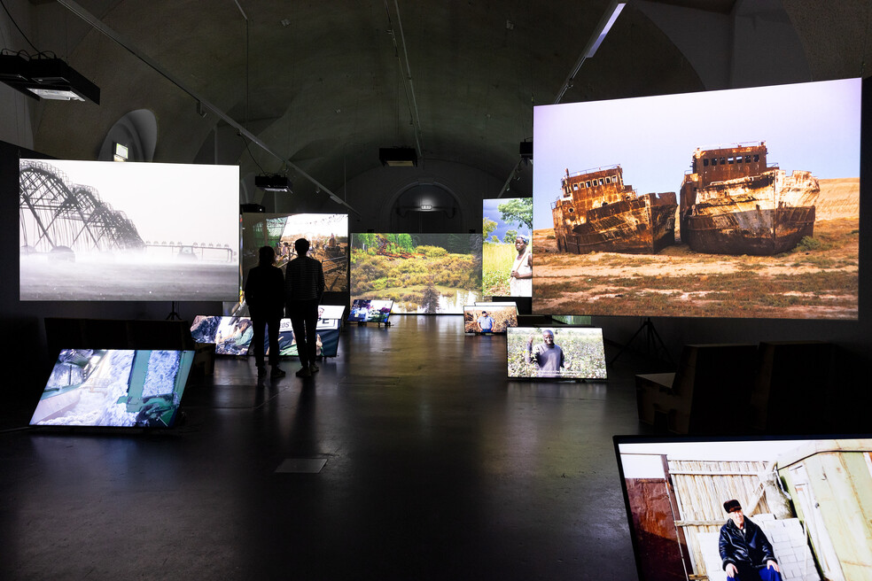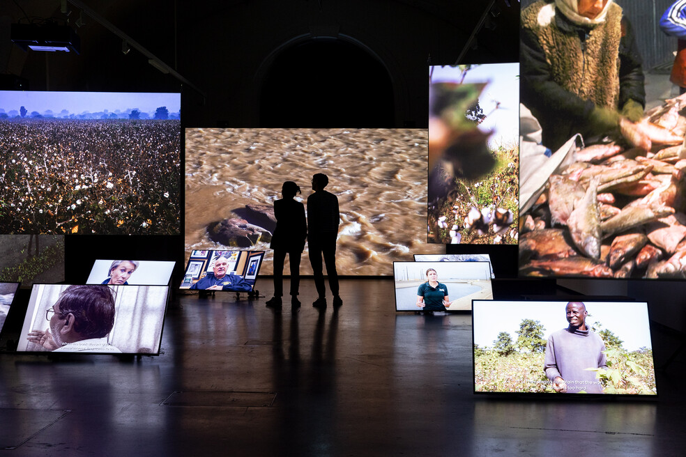 The multi-channel video installation LandRush by the artist duo Frauke Huber and Uwe H. Martin documents the social and ecological consequences of global agriculture. Working with farmers, fishers, scientists, Indigenous people and activists, they explore worldwide themes such as seed, water and land rights, environmental justice, climate change, and the future of agriculture, highlighting global relationships and individual approaches alike. Frauke Huber and Uwe H. Martin use artistic, journalistic, and scientific strategies to make different lived realities tangible on an intellectual and emotional level. Their many years of research and documentation have resulted in publications and interactive apps, as well as the multi-channel spatial installations – works of remarkable atmosphere and content – that are presented in the MQ Freiraum.