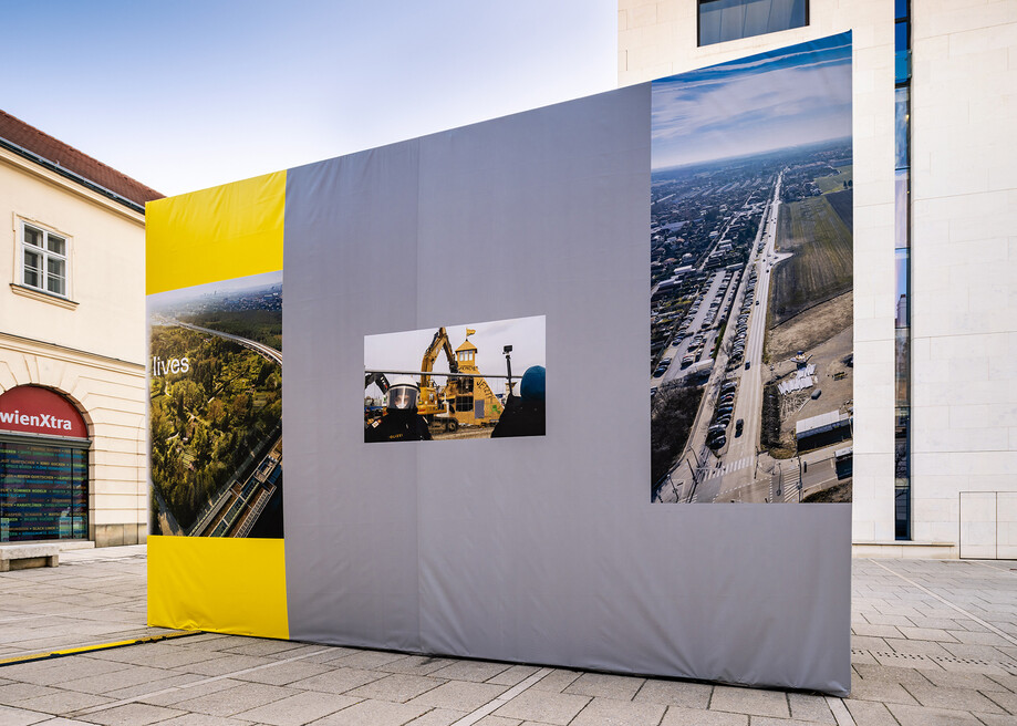 The photographic works focus on Vienna's most discussed occupation: In order to prevent the construction of an urban highway, construction sites were occupied for five months. At the U2 station Hausfeldstraße, construction machines were blocked and wooden buildings were erected to maintain the occupation through the winter. On February 1, 2022, there was a police eviction, during which 48 activists were arrested.
