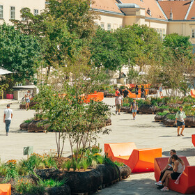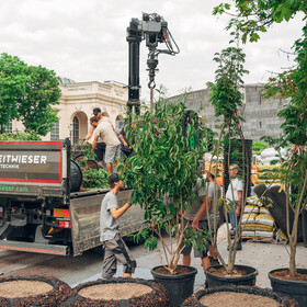 In the MQ Main Courtyard, trees such as silk acacia and zelkova, as well as plants such as willow-leaved sunflower, dewdrop grass, torch lily and montbretia will create a 'Mediterranean Flair'. In the Fürstenhof, large-leaved shrubs such as pawpaw, hop poles with overhangs, large-leaved funkia and ornamental grasses will give a 'jungle feeling', so that children can experience nature in the middle of the city. 'Pink Cloud' is the theme of the Staatsratshof near Architekturzentrum Wien. It will feature forest pines and grasses such as pampas grass or cushion bush, as well as evergreen spurge and palm lilies. On the MQ Forecourt will stand a 'Parliament of Climate Trees' – a selection of ten climate trees with information panels - as a plea for an awakening and the necessary changes in the design and planning of urban spaces.