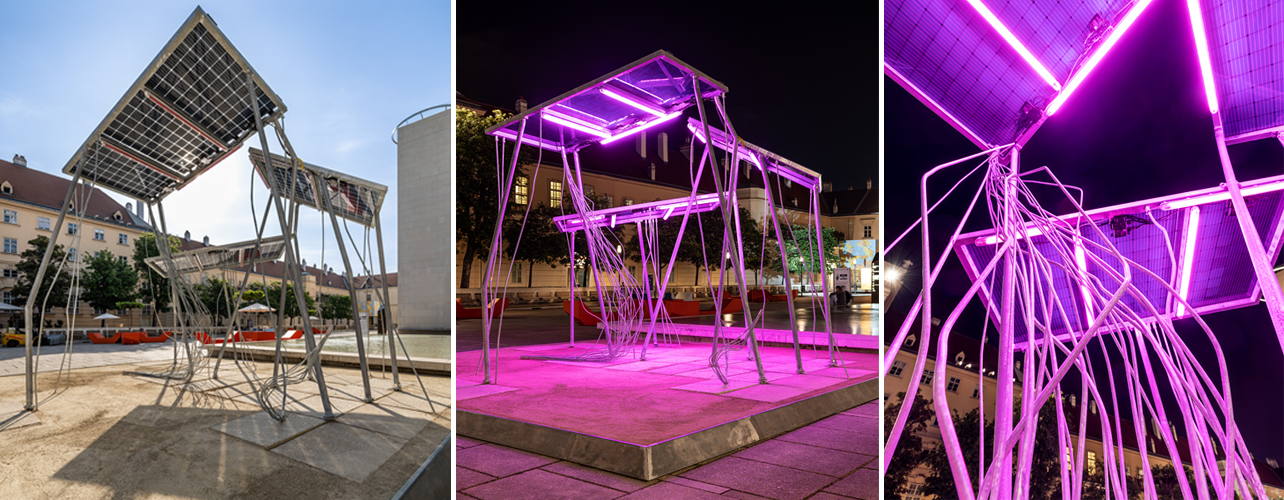 In her artistic work, Judith Fegerl deals with the visualization of energy. For the MQ she has designed a sculpture made of photovoltaic modules, steel, light bodies and electronic components. During the day, "converter" converts solar energy into electrical energy and feeds it into the power grid. At night, the sculpture becomes a consumer of the fed-in solar energy and emits intense light in violet color.