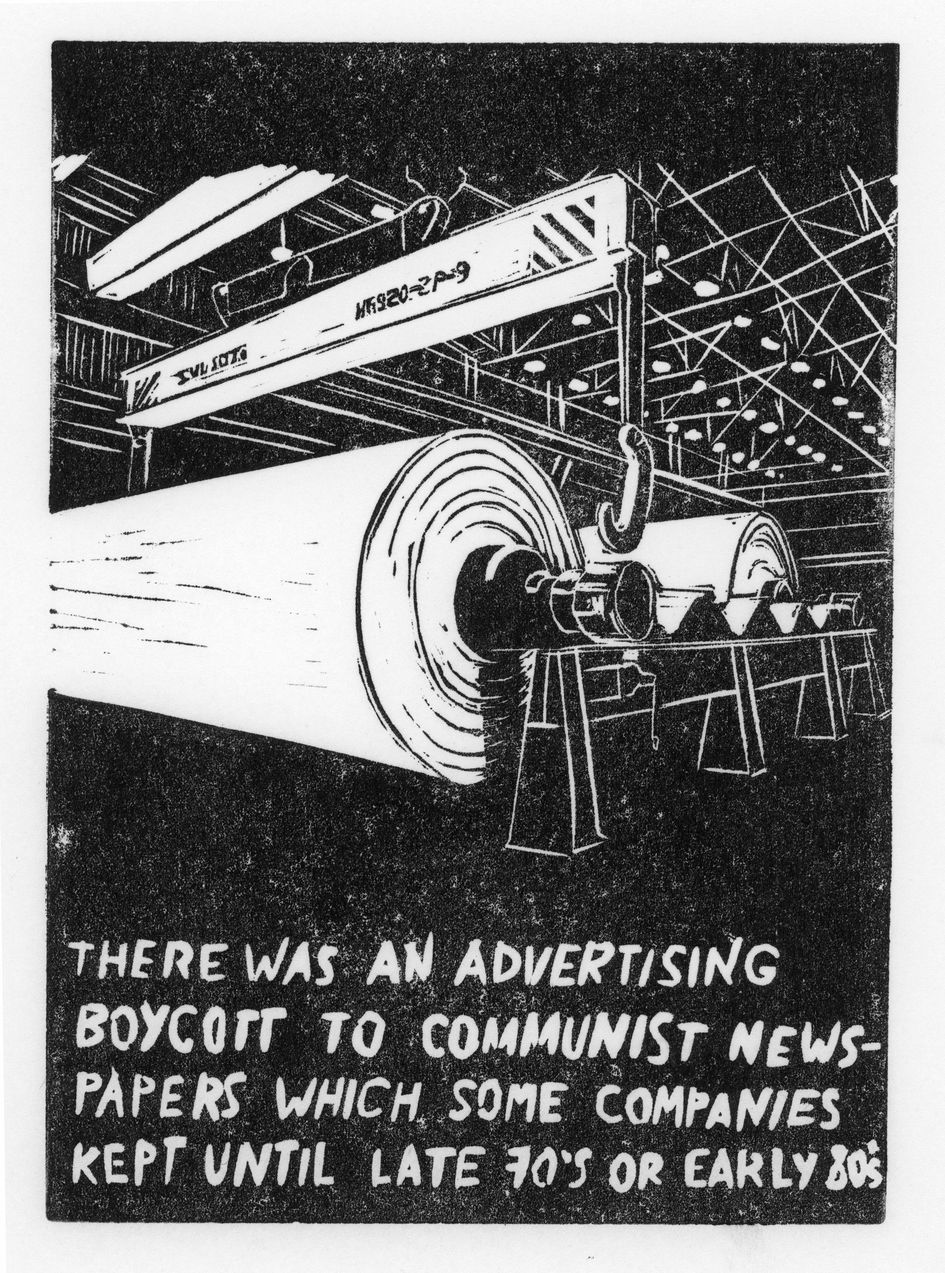 Minna Henriksson investigates both lobbying and political engagement around the Finnish paper industry and its trade with South Africa after the Second World War. The linocuts relate efforts by Finnish industrialists to counter the left-wing politicisation of their workers.