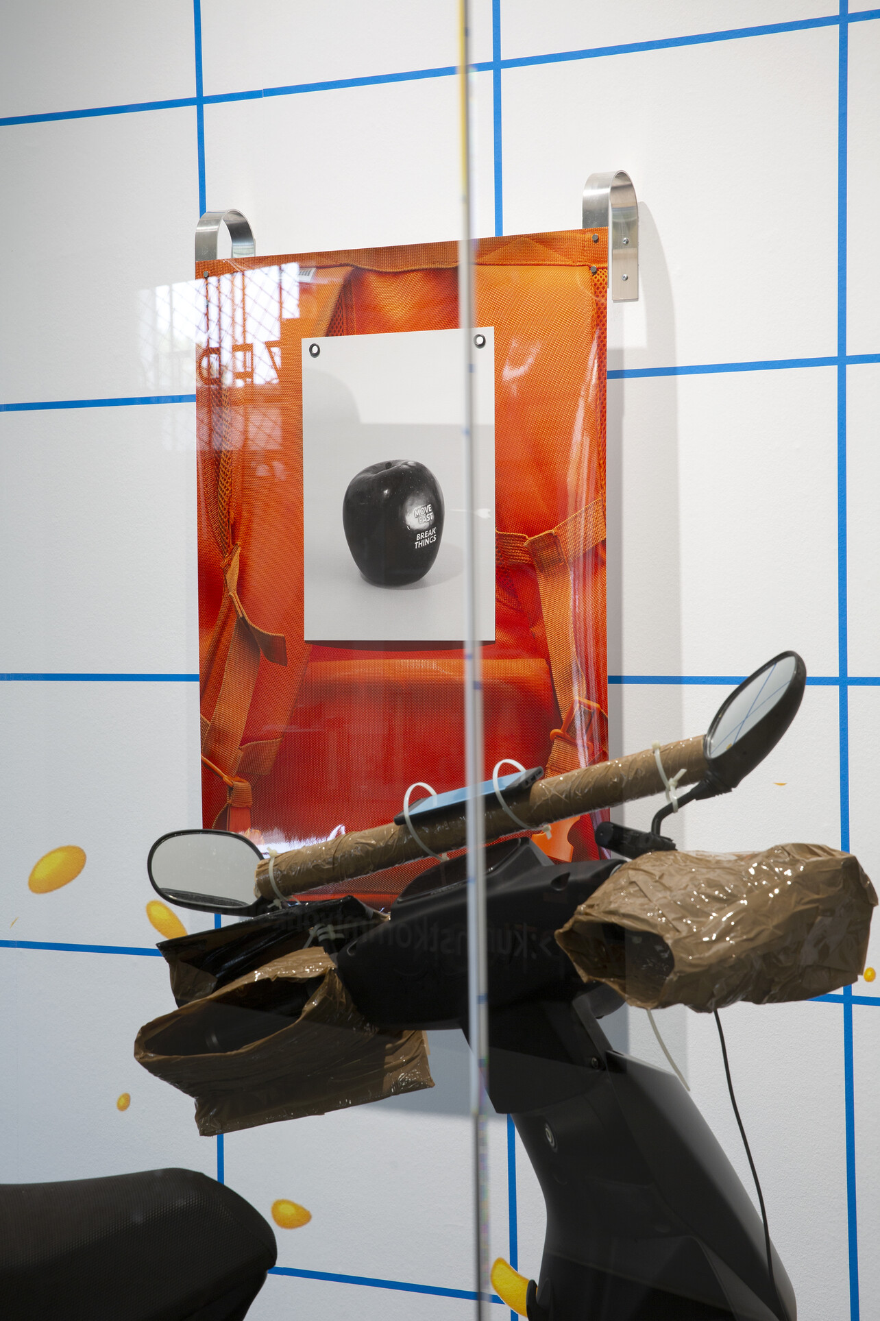You also address this foggy feel-good bubble, which is often shaped around precarious working conditions, in your video work „From Me to We", which can currently be seen in the EIKON Schauraum—and which is appropriately played on e-scooters that are typical of messenger services. Would you like to take us briefly through this video work?