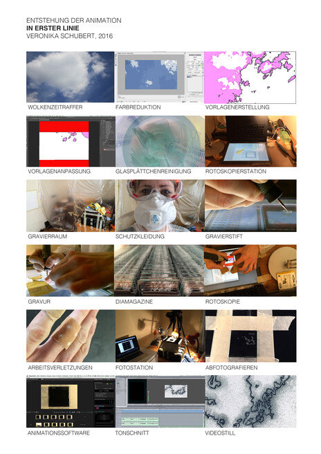 The animated film ‘In erster Linie‘ is about the refugee situation in autumn 2015. It was a very ‘grave’ subject for me, which is why I engraved 3,000 glass plates for the animation. They depict the contours of cloud movements I had previously filmed in time lapse and used to create templates. I employed rotoscopy to engrave the images in the glass. The sound collage, consisting of TV quotes taken from politicians and news presenters, illustrates the helplessness and ineptitude of the Austrian government.