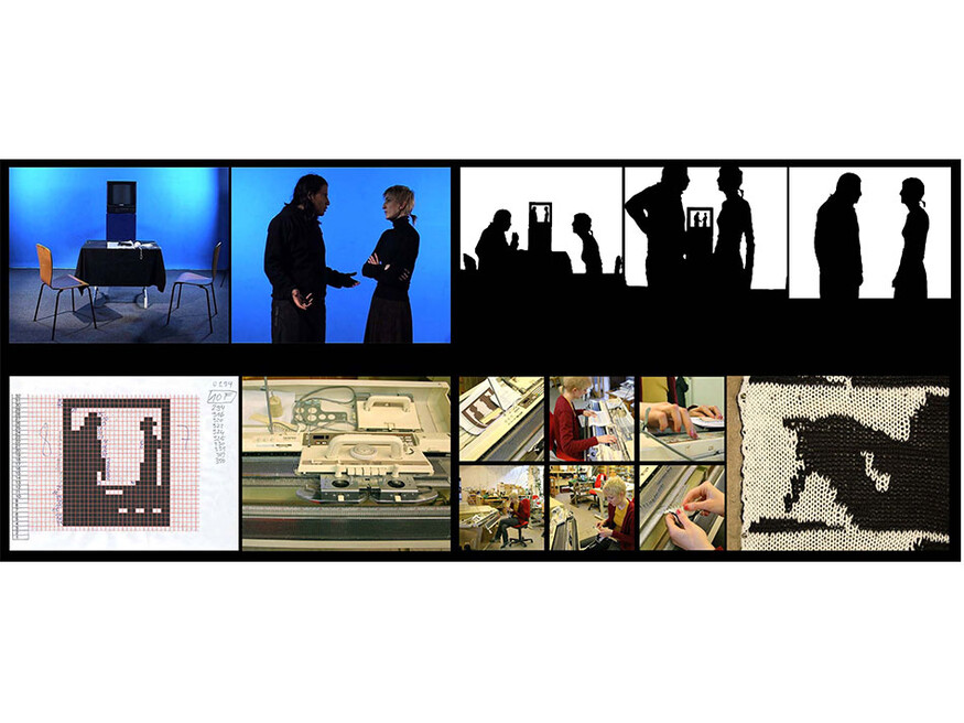 My diploma film project, ‘Tele-Dialog‘, is about afternoon and early evening entertainment television, which is rather simple in terms of themes and style. The animated film consists of 800 individually knitted pictures, produced by myself. I created a video template and turned it into pixel images, which I then printed out and used for knitting instructions: one stitch per pixel. This technique turned out to be very ambitious. The result was ’wool sausages’, which I had to iron, starch and put on a nail board in order to take pictures.