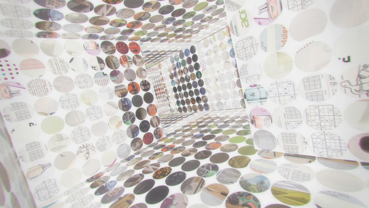 Veronika Schubert: The algorithm of Instagram tries to push me toward something it thinks I need. That makes me angry, it makes me want to react creatively. Especially sponsored content, which is often difficult to distinguish from friends’ content, served as my source material. But advertising does not only rain down on us digitally, it is also sent to us by mail. I used such advertising folders and punched out circles, affixed them, scanned them and further processed them with a  mosaic software. A 3D programmer built maze-like rooms according to my instructions. Then, I designed the rooms’ ‘wallpaper’ using the circles.