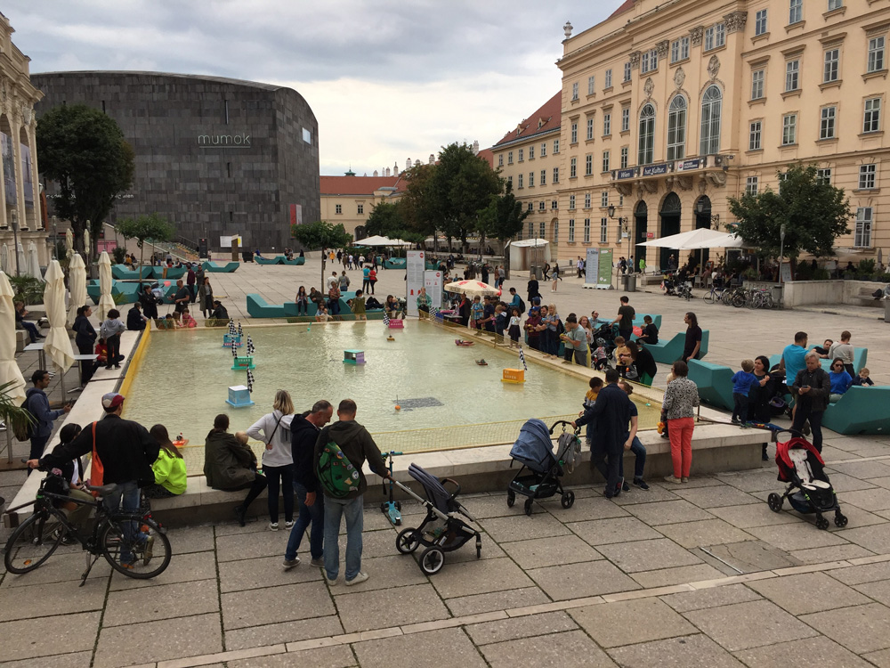 Once again, light and installation artist Martin Markeli transforms the MQ pool into an island world. Visitors can explore it on various floating objects. The Aquadome is a temporary installation which allows navigation and coordination through an analogue approach. The self-made floating objects (boats) facilitate interaction.