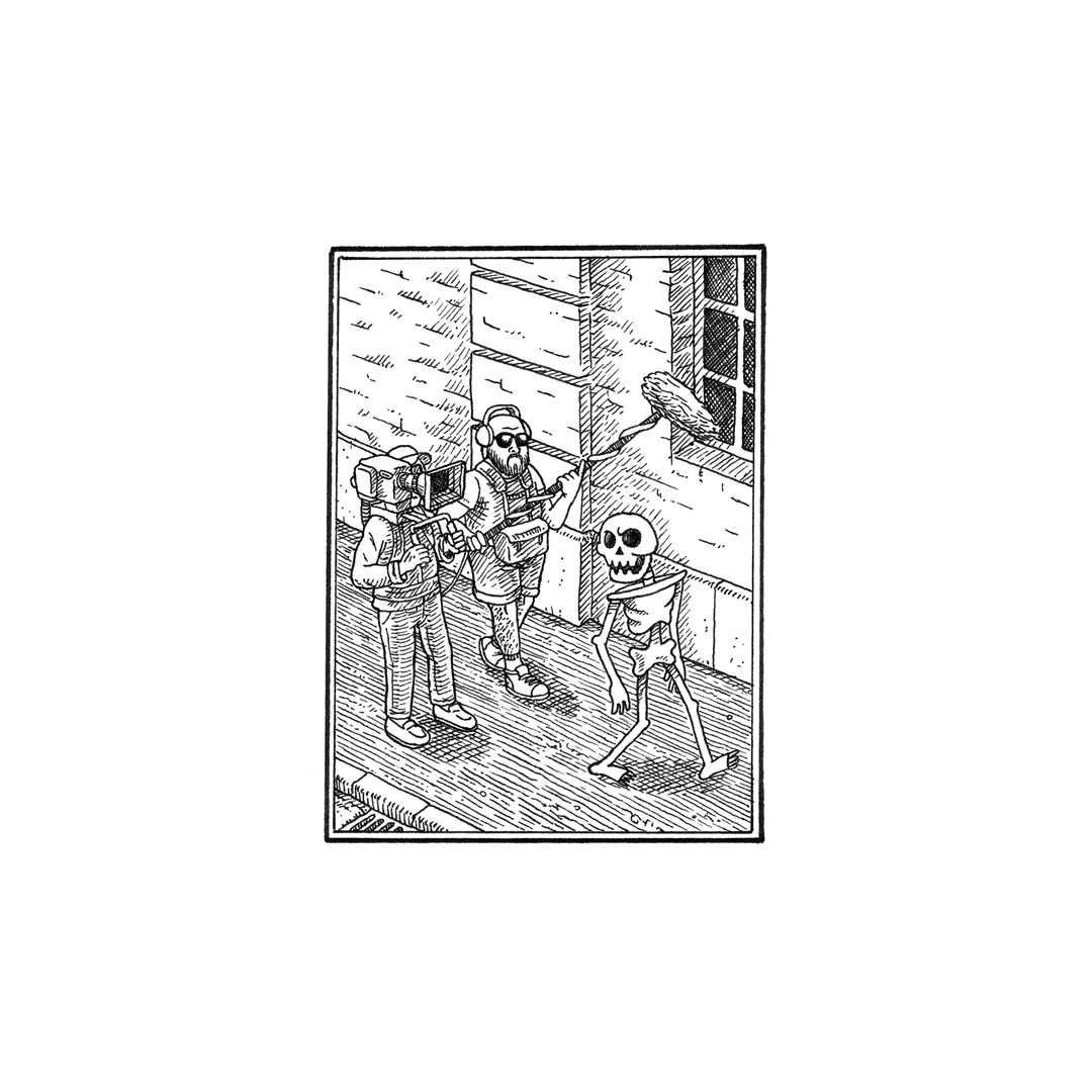 The personification of Death in the form of the classic skeletal Grim Reaper is an interesting character of its own. A seemingly European character that goes back centuries, existing alongside religious imagery, but really with more of a secular nature. In Holbein’s time, death was not yet commonly represented as one individual, but rather as a group of skeletons. For me, however, it was natural to represent death as one skeletal figure, like we know him today. There is a lot of funny stuff you can do with such a character, but I wanted this book to be little bit different. Sometimes funny, yes, but also with some social commentary and imagery that can hopefully make a European reader reflect on death today. Originally, Holbein’s prints were presented on single sheets as miniature woodcuts with a description or title in German. These were later replaced by Bible quotes. I wanted to stay as true as possible to the original idea and draw the panels in the tiny size they were printed in by master woodcutter Hans Lützelburger, a stunning 48 x 65 mm, which is something I think few people are aware of. This also represented a technical challenge for me, even though I only used a pen, but it gave me necessary resistance.