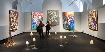 The element that binds together the entire installation is the light that refracts off the surfaces of the paintings and lamp sculptures. The light of the ‘small fires’ in the title appears as a reflection of many small focal points – symbolic of a region, and a world, in turmoil. The lamps scattered throughout the room carry both personal and societal meanings. In Živković's mother tongue, ‘looking like a lamp’ is a derogatory metaphor for a woman who is seen as overly dolled up and degraded to an object of desire. The artist appropriates this expression and contrasts it with a tender memory: in the years after the war, as a child, she helped her father cut metal bases for lamps.