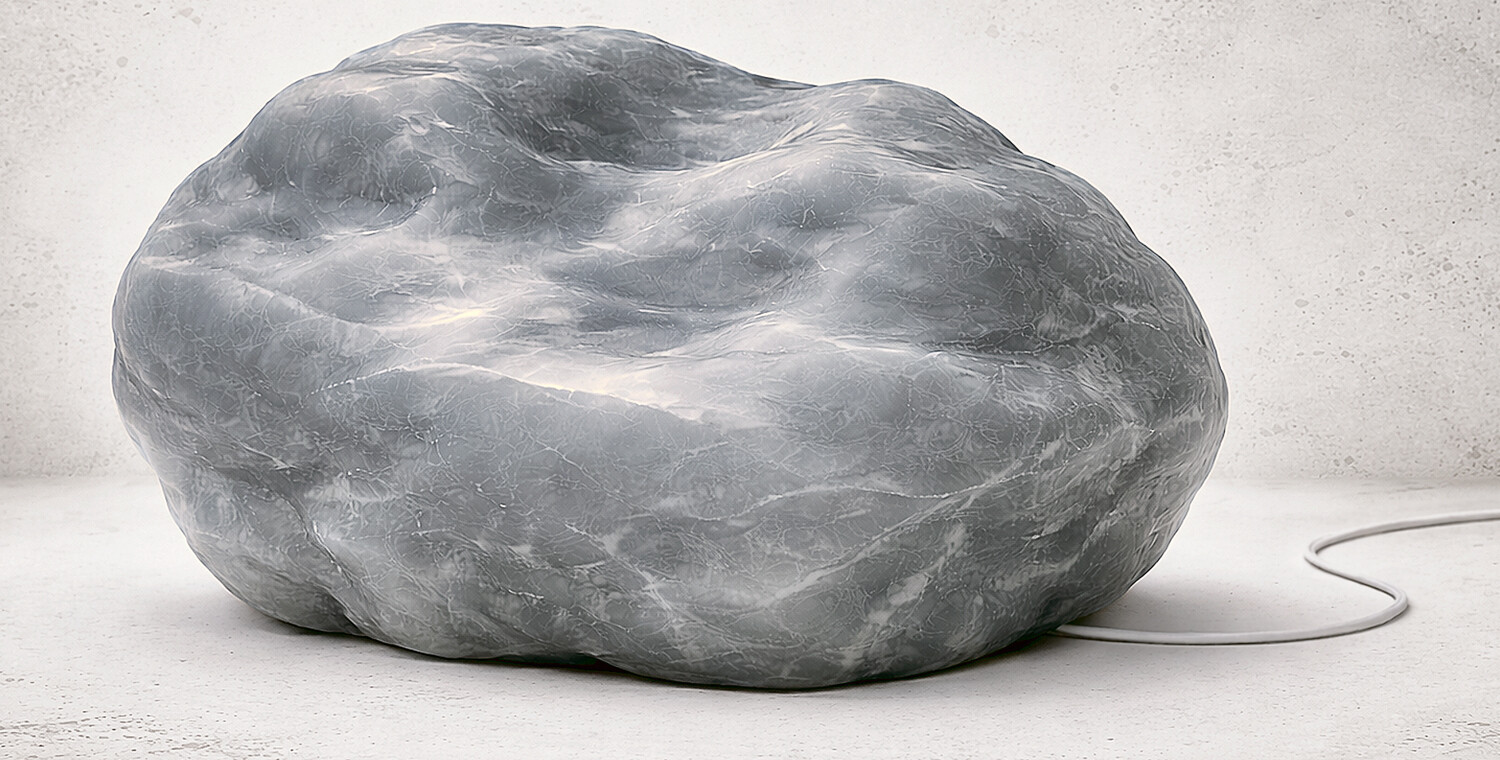 The object is an artificial replica of a boulder. It is not made of rock, but of silicone, a soft, body-like material. It has no geological origin and does not share the weight, coldness or ageing processes of natural stones. The object does not move in space. It merely generates an internal movement in the form of a pulsation. This movement has no purpose and conveys no information. It simulates activity without performing any action or reacting to anything.