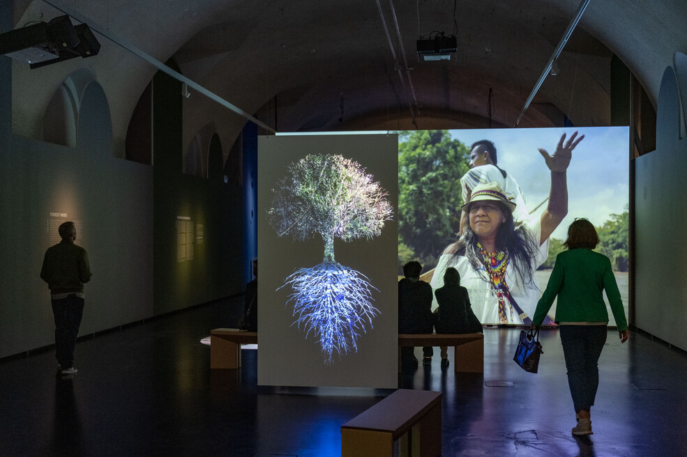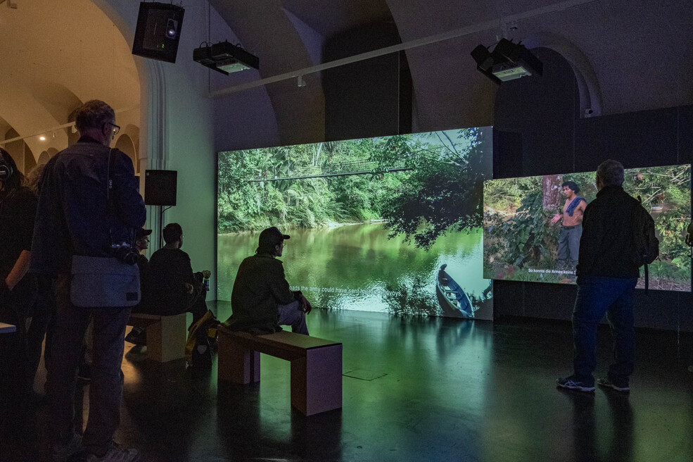 Swiss artist Ursula Biemann's first solo exhibition in Vienna focuses on her video works from the past ten years, in which she explores various ecological conditions, living realities and natural relationships: Forest Law (2014), Acoustic Ocean (2018), Forest Mind (2021) and Devenir Universidad (2019 - 2023). Ursula Biemann's artistic practice is research-driven, collaborative and based on traveling to remote places from Greenland to Amazonia, where she investigates climate change and the ecology of oil, ice, forests and water. "Based on field research in the forests of the Colombian Amazon, my recent art videos and collaborative action projects bring together different strands of knowledge about the intelligence of nature and the relationships between all the creatures that inhabit these spaces," says the artist. Biemann sensitively and astutely observes and analyzes the given social, knowledge-based and legal systems that shape the relationship to nature. In her multi-layered videos, she interweaves atmospheric and documentary landscape shots with science fiction poetry, individual stories, cosmological orders and scientific findings to illustrate a changing planetary reality and tell it with new narratives.
