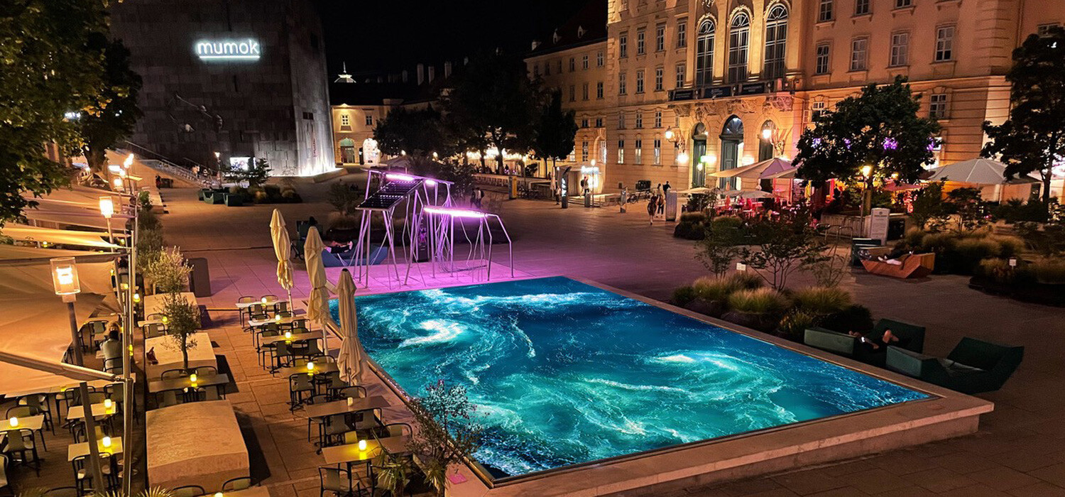 To mark World Water Day on 22 March, Lumine is presenting the projection installation “Stille Wasser” on the water basin at the MQ. The installation can be viewed on 22 and 23 March. Visitors can listen to the audio for the installation via livestream using their own mobile phones and headphones. A QR code on the edge of the water feature can be used to connect to a music stream.