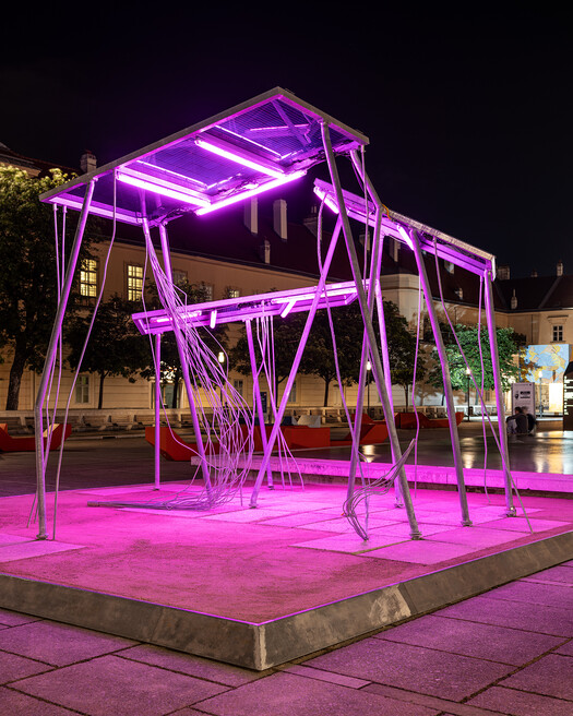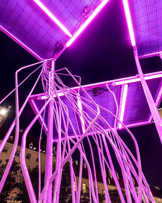 Während die Photovoltaikpaneele tagsüber Sonnenenergie in elektrische Energie umwandeln, die ins Stromnetz eingespeist wird, spendet die Skulptur den Besucher:innen Schatten – sie können sich darunter aufhalten. Nachts kehrt die Skulptur das Produktionsverhältnis um und wird zur Konsumentin von zuvor eingespeister Sonnenenergie. Sie strahlt intensives Pflanzenlicht in violetter Farbe ab. Die technoid-organische Gesamterscheinung der Skulptur erinnert an ein Hybrid aus Maschine und Organismus, wirkt archaisch und futuristisch zugleich.