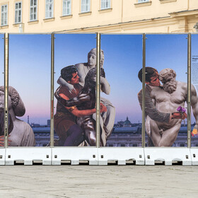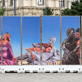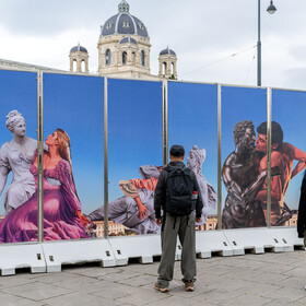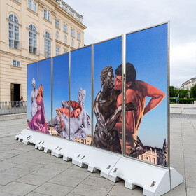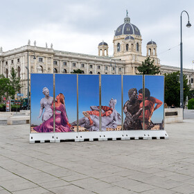 Die Künstlerin collagiert Figuren von solchen Covern mit Abbildungen von historischen Skulpturen aus der Sammlung und von der Fassade des Kunsthistorischen Museums Wien und macht so die Idee einer „queer Magic in Vienna"sichtbar.