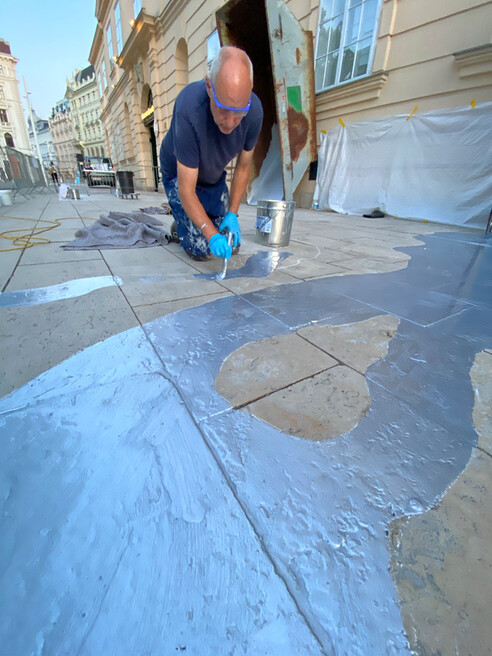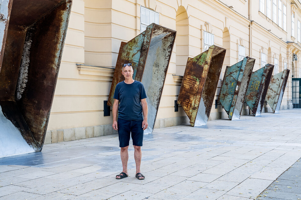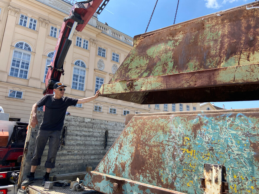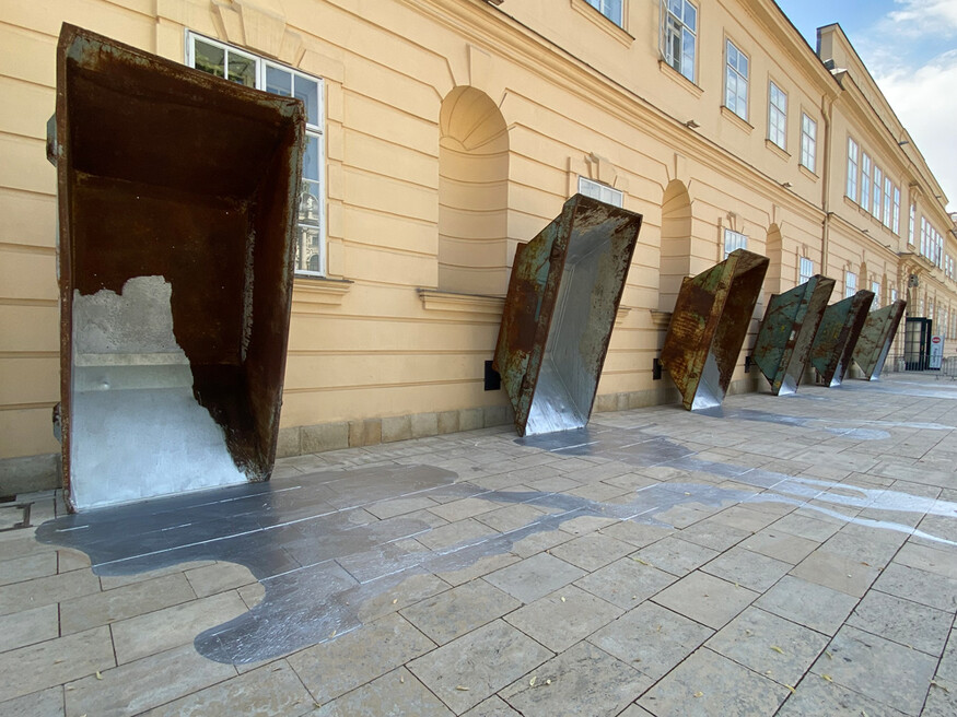 Die gewählte Farbe Silber verstärkt die industrielle Anmutung der Arbeit, reflektiert Licht, Oberfläche, Wert. Gleichzeitig irritiert sie – wie die labile Stellung der Mulden – unsere Wahrnehmung und fordert zur Reflexion heraus: Was bedeutet es, wenn etwas aus dem Lot gerät? Im urbanen Kontext des MQ-Vorplatzes wird Off–Balance zur Intervention im öffentlichen Raum, zum Ort für eine poetische Verschiebung, die gesellschaftliche, ökologische und künstlerische Fragen ineinanderfließen lässt.