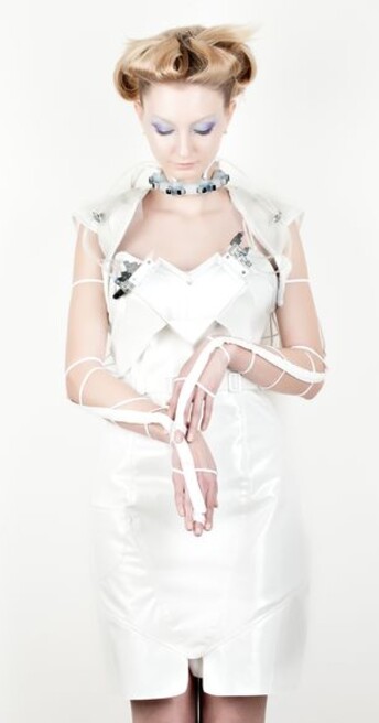 She seeks to create a 'higher connectivity of the senses through the medium of clothing” by investigating the extent to which we experience fashion (emotionally, intellectual and sensual levels) by projecting technology as an extension or prosthetic of the body. Investigating the extent to which we experience fashion (emotionally, intellectual, and sensually) both from a physical as well as psychological angle, Wipprecht’s designs responds to us, while also affecting our sartorial experiences. Producing garments which aim at more than just the traditional function of coverage and adornment, Anouk’s techno-fashions are one-of-a-kind, architectural, avant-garde statements with bold silhouettes, vested with circuitry and a regalia of plastic tubes, fluids,smart foils and the ability to respond in an unique and remarkable way to the human body and his or her surroundings.