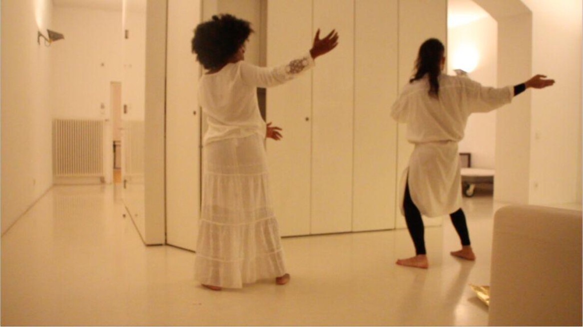 Also with this residency I was able to bring my friend, the artist Juliana dos Santos so we could work together, we did Fine Arts college together and she was invited to be part of an exhibition Weiterleben at the Academy of Fine Arts of Vienna. With her presence our creative process was stronger and she took part in one the series of the performances I was developing and we presented the conclusion piece naming it “Invisible Moving”, Juliana has a research on the afrobrazilian culture and her presence was fundamental for the development of the work. We presented for 5 hours consecutives this performance in the studio 513, moving in circles around the central structure of the studio. It was open to the audience and at the end it had a vibration of a celebration – over all it was a mix of ritual, performance and party, we were honoring in that day our living grandmothers, fact that connected our poetics.