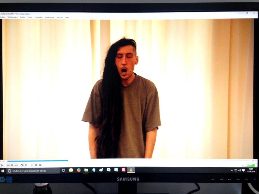 Day 1: arrived in Wien. I don´t speak German. I enter MQ for the first time in my life. Hot day. Mission: talk to strangers. That same night I met Moki and some valuable information popped out: Gruft Shelter near MQ. Day 2: Go to Gruft. Potentially find my performer. I found Steve. We talked. We shared some information. I told him I was coming back to see him again. I invited him to perform. Next days: Can´t find Steve. Communication was getting harder. Authorizations, Steve missing, still not speaking German. Day 5: I found Steve. We went to the Baroque Suite at MQ and shot our first and only video. His performance was all about talking. Speeches. I liked it a lot. Next days: just looking for him around the city, thinking of him. A random day in Wien: Visit Museums, exhibitions, and some walking around. I met Dalibor. Simultaneous Interpreter. I said I needed him. I needed help. Few days after: Dalibor came back to MQ to perform as an Interpreter, interpreting Steve´s low volume surreal German-English speech into clear German. That same day I invited Martina, whom I met at Autgarten Park, and saw for second time the night before the shooting in a party at Fluc. I decided I wanted to do a video with her doing some body poses I wanted Steve to do before his disappearance. Everything continued been only about Steve presence and absence. One day: I decided to write some questions on a floor and took pictures of those German words I wrote without understanding them. After these photos I decided that my work was done. Lasts days: I continued looking for Steve but my hours where more about going to the lake to swim naked than staying inside a Museum or walking with clothes on.