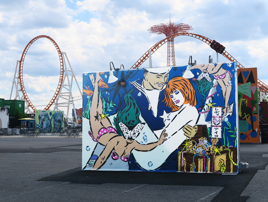 She worked with Banksy on “Exit Through the Gift Shop” in 2010. Her large scale works indoors and outdoors are installed in many cities, including Miami’s Wynwood Walls in 2009, New York City’s Bowery Wall in 2013, and Coney Art Walls in 2015/2016/2017, all three curated by Jeffrey Deitch. AIKO has also been involved in a large collection of group shows, from “AnimamixBiennale” at Shanghai’s MoCA in 2009 to “Edo Pop” at Japan Society NYC in 2013, ‘Some Place Like Home” at Rumney Guggenheim Gallery NY in 2015 to her more recent solo show, “Sweet Heart” at The Outsiders Gallery in the UK in 2014.