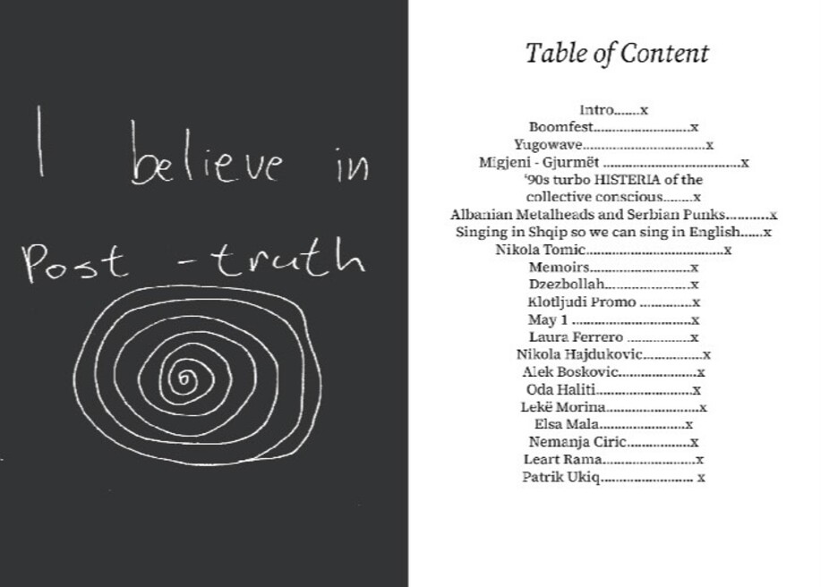 Myrseli möchte auch seine ethnomusikologische Studie über die Musikszene in Prishtina und Belgrad präsentieren. Diese wird durch Archivmaterial, visuelle Zeichnungen, Memoiren und Interviews mit Teilnehmenden ergänzt und bietet eine tiefgehende retrospektive Betrachtung von Beziehungen, basierend auf den ersten antifaschistischen und sozialistischen alternativen Musikzusammenkünften. Dabei wird die Geschichte durch persönliche Erzählungen der interviewten Teilnehmenden nachgezeichnet: fünf aus dem Kosovo und fünf aus Serbien.